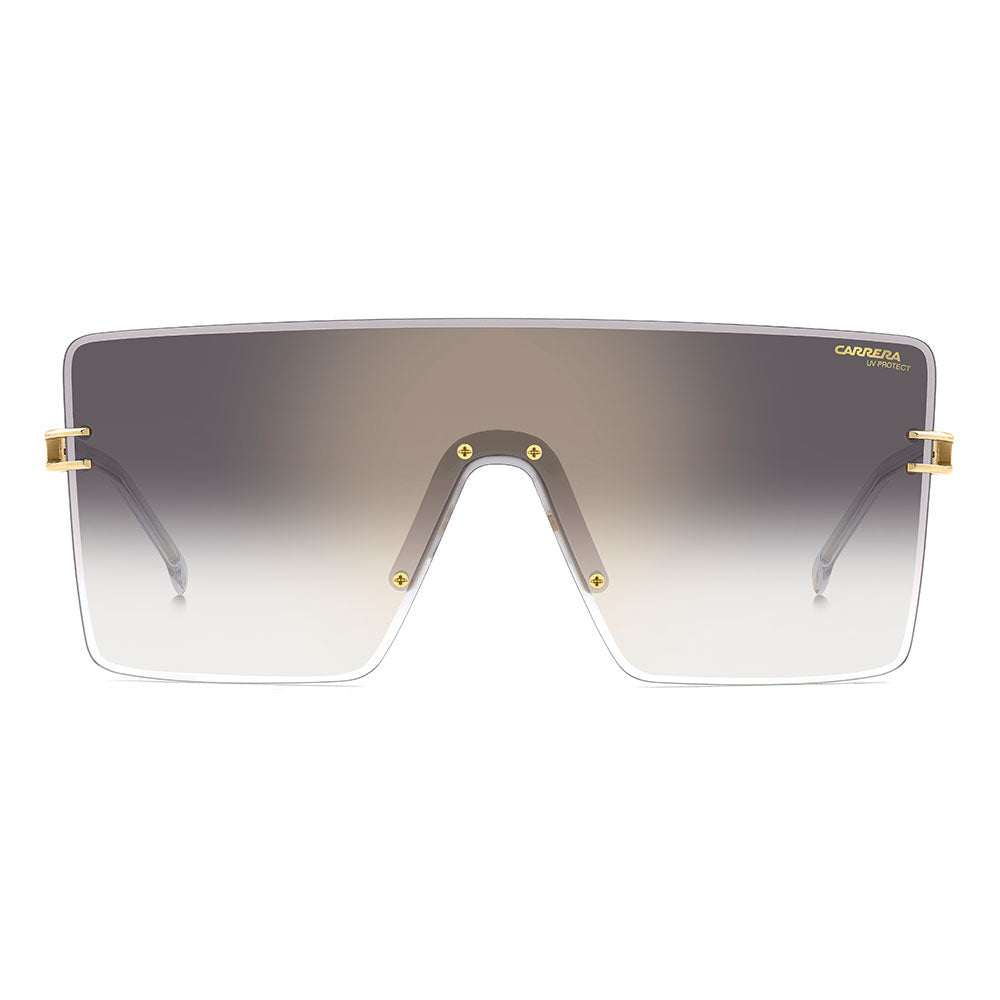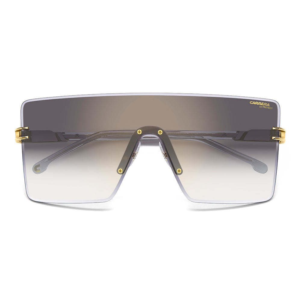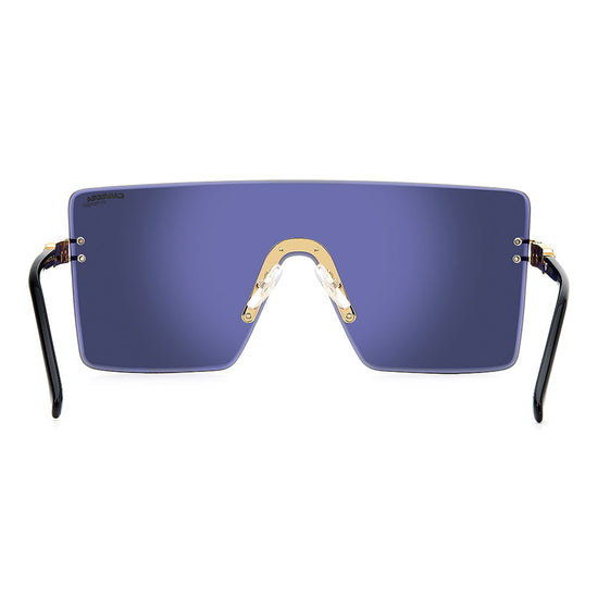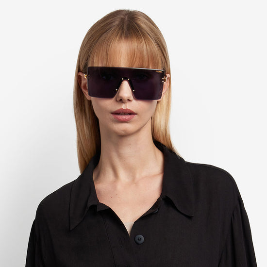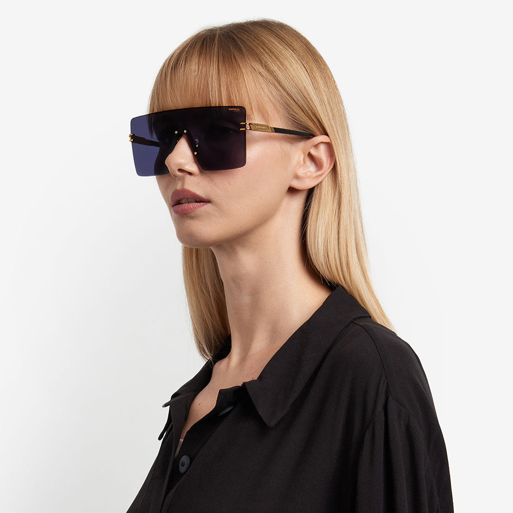 Unique at first sight: the front of these women's sunglasses is a rimless square shield lens trimmed by visible screws which are as functional as they are beautiful. The iconic temples have an embossed logo and acetate end tips, including a transparent option. Flex hinges guarantee on-point comfort. The mirrored lens versions are extra cool.