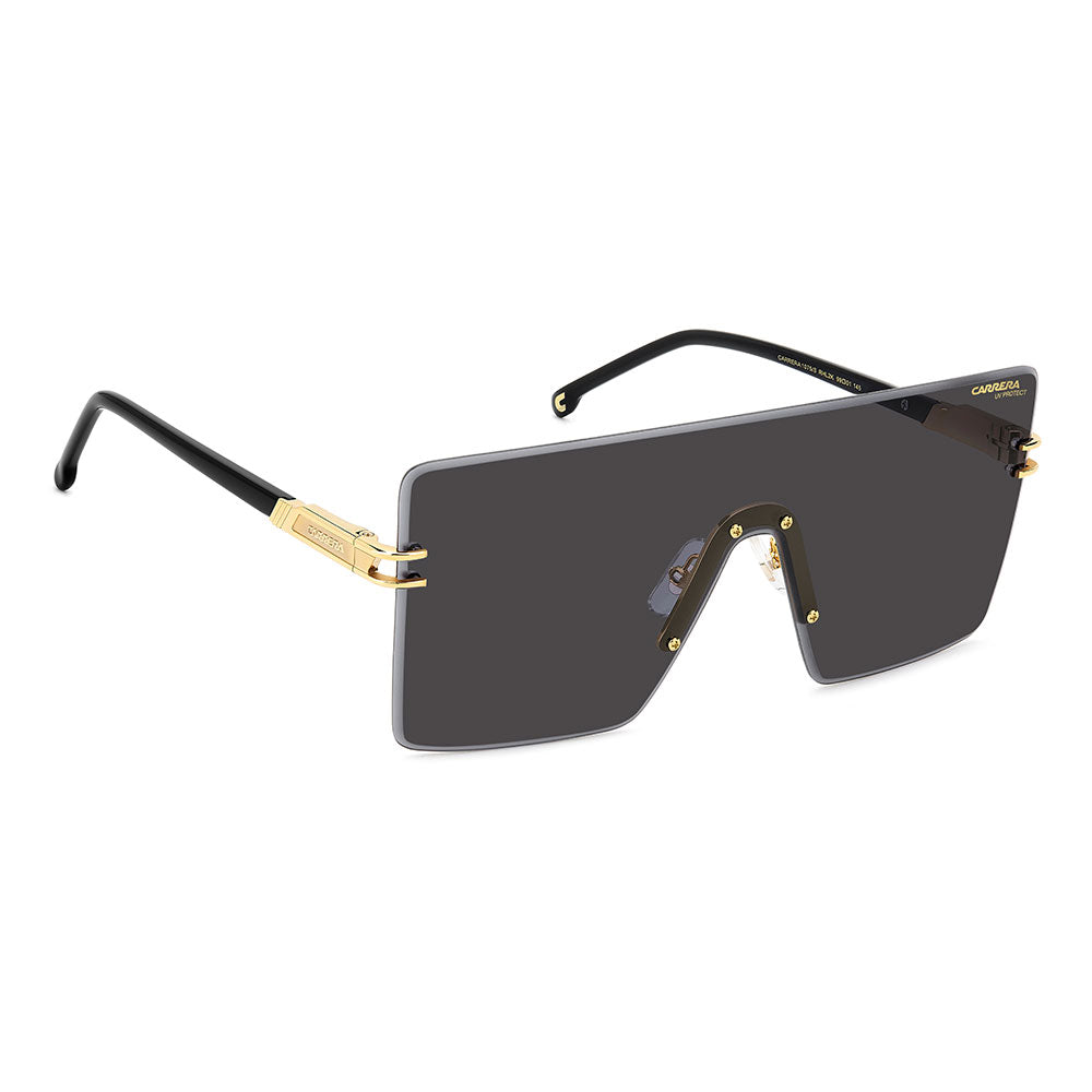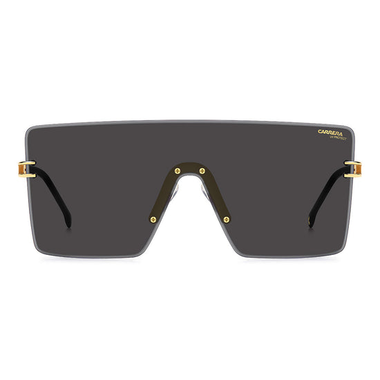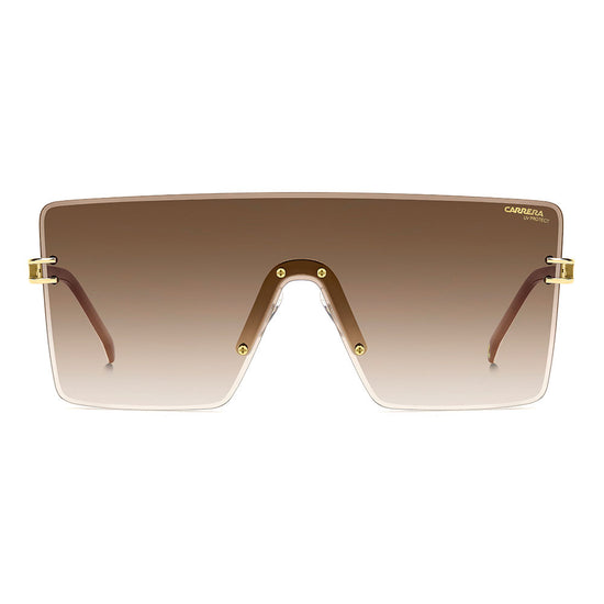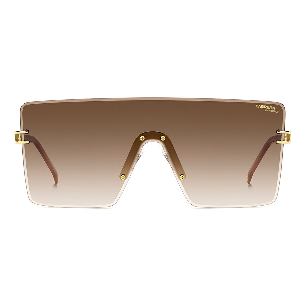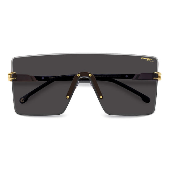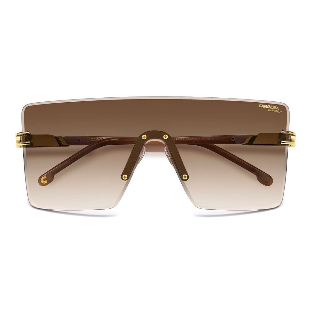 Unique at first sight: the front of these women's sunglasses is a rimless square shield lens trimmed by visible screws which are as functional as they are beautiful. The iconic temples have an embossed logo and acetate end tips, including a transparent option. Flex hinges guarantee on-point comfort. The mirrored lens versions are extra cool.