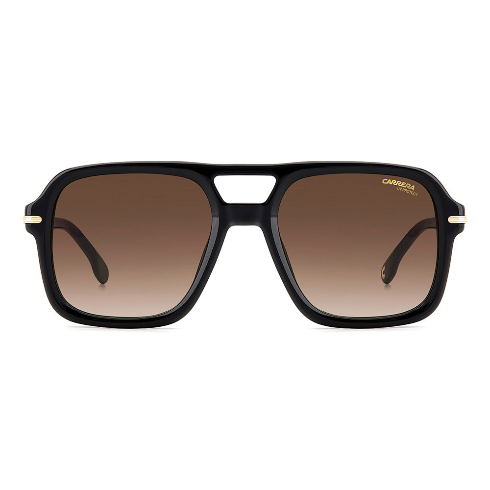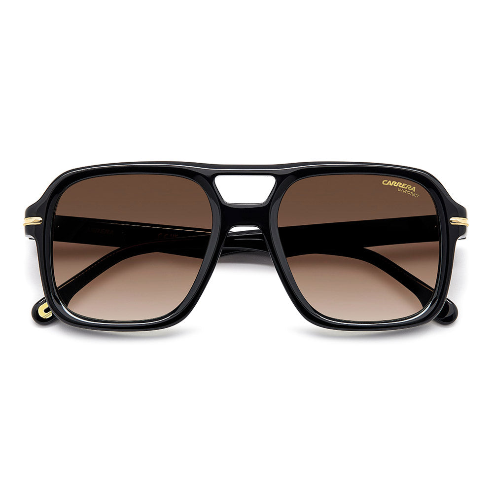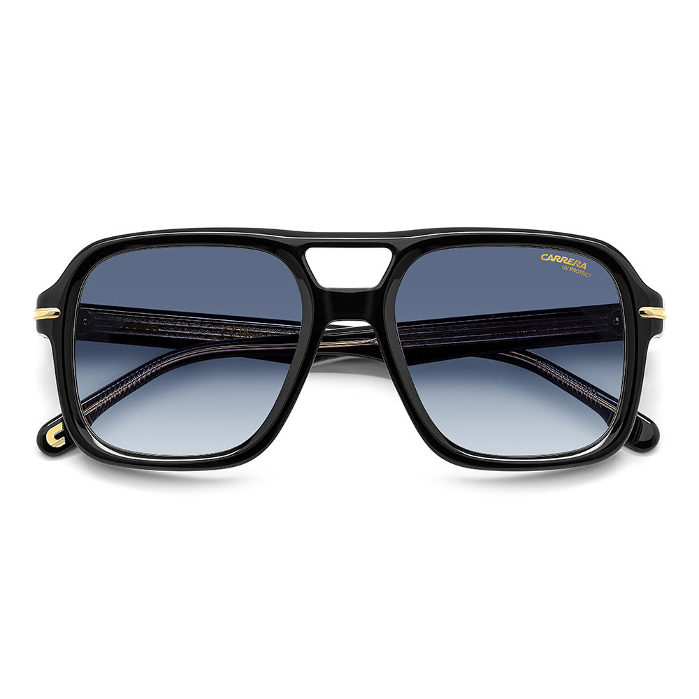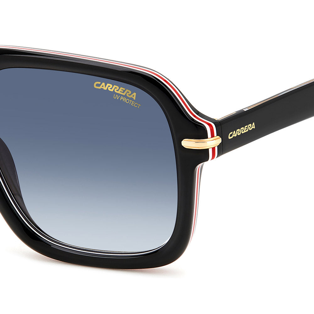 The spotlight is on these bold sunglasses with prominent, sculpted proportions. Embracing one of Carrera’s most popular styles (the double-bridge navigator), here the frames are in acetate with raised metal inserts at each side, complemented by slender temples. The colourways include a multi-layer option and transparent versions with a visible textural core. These glasses can be fitted with prescription lenses.