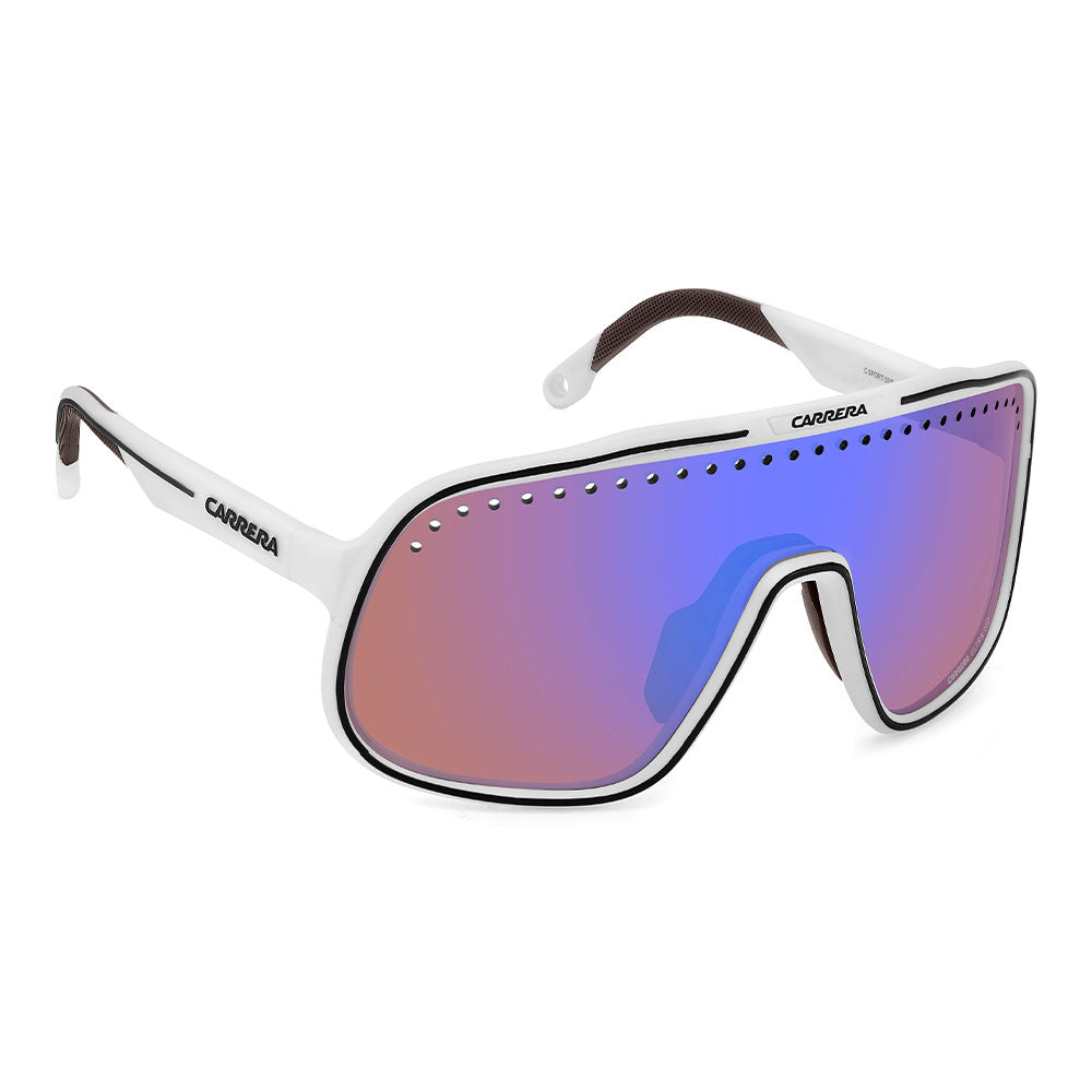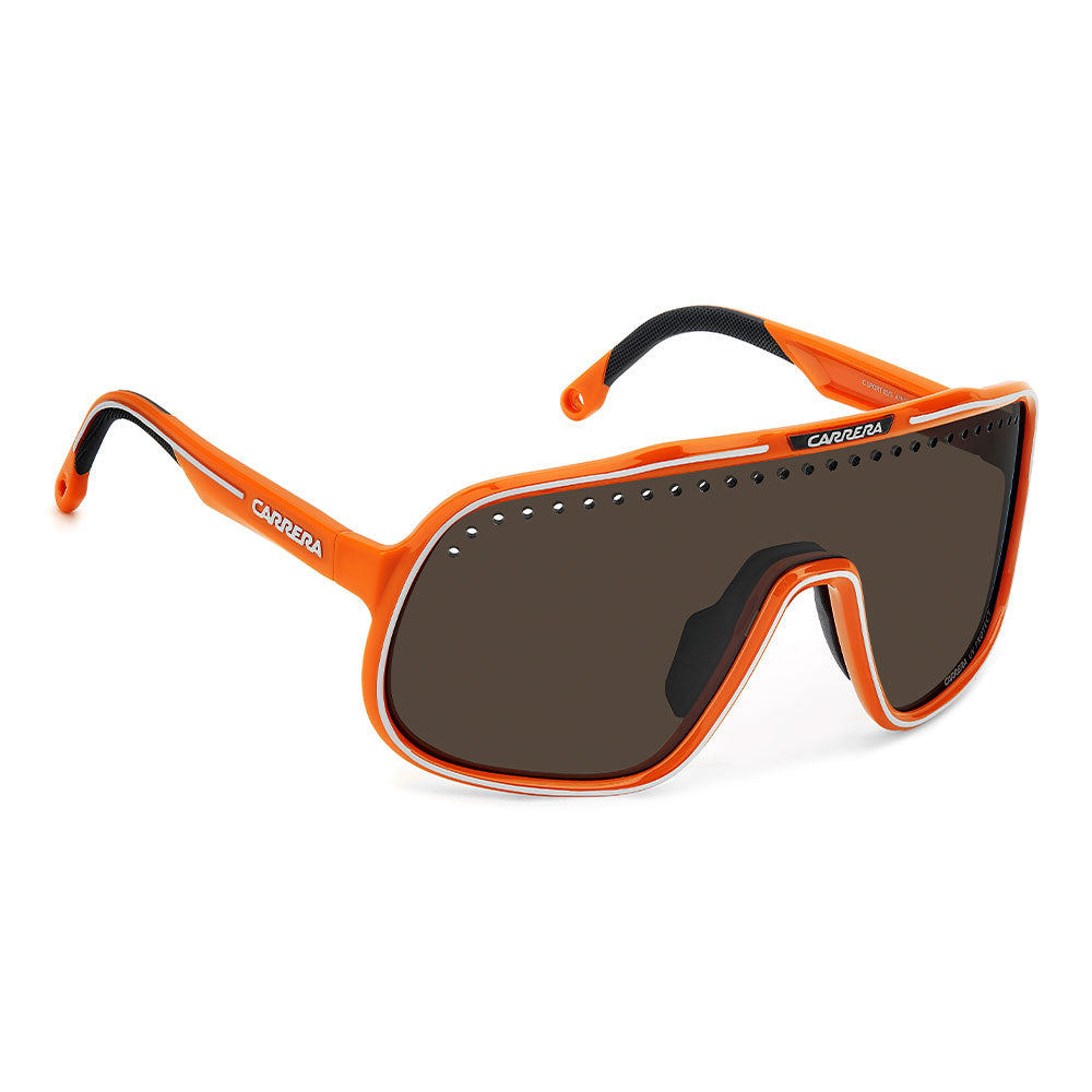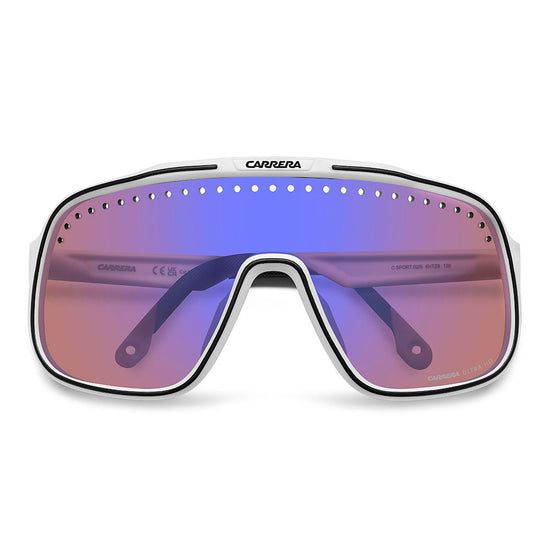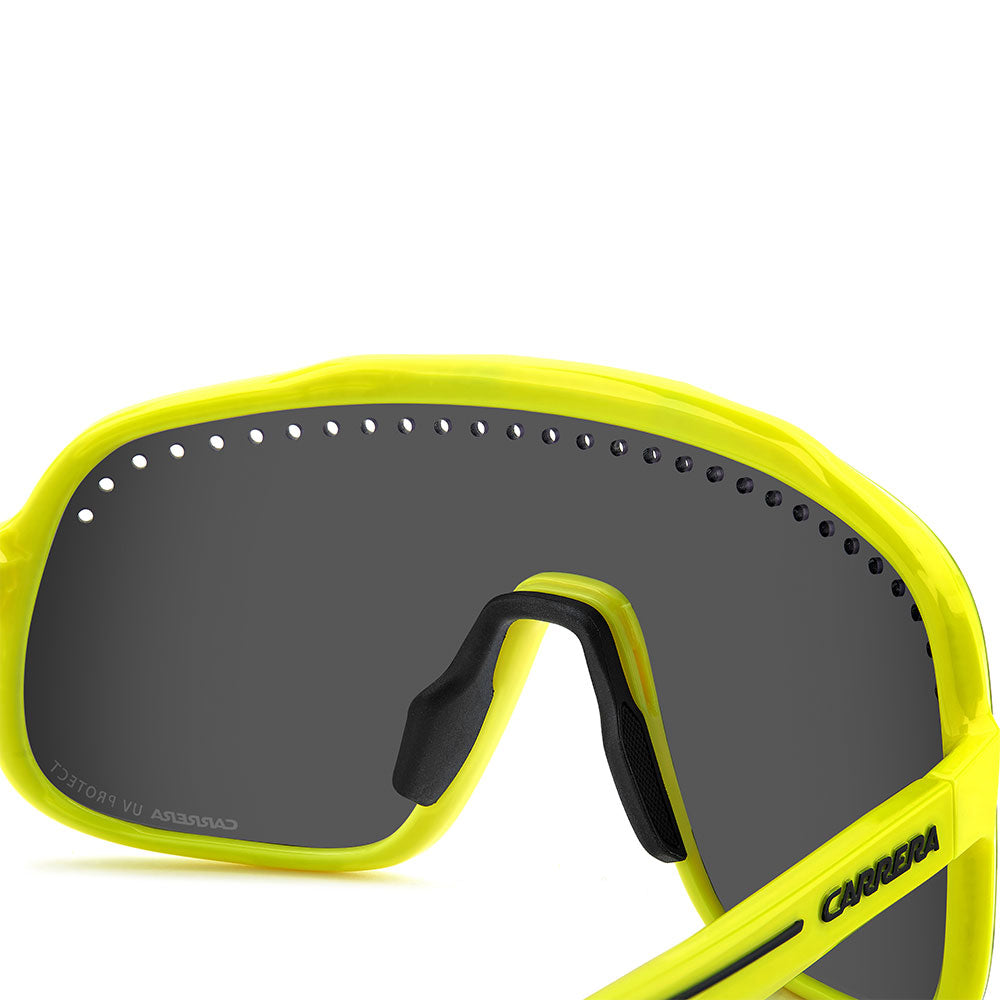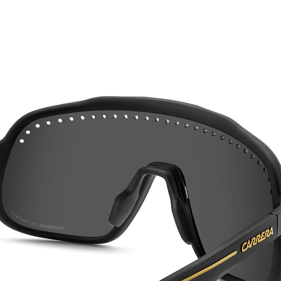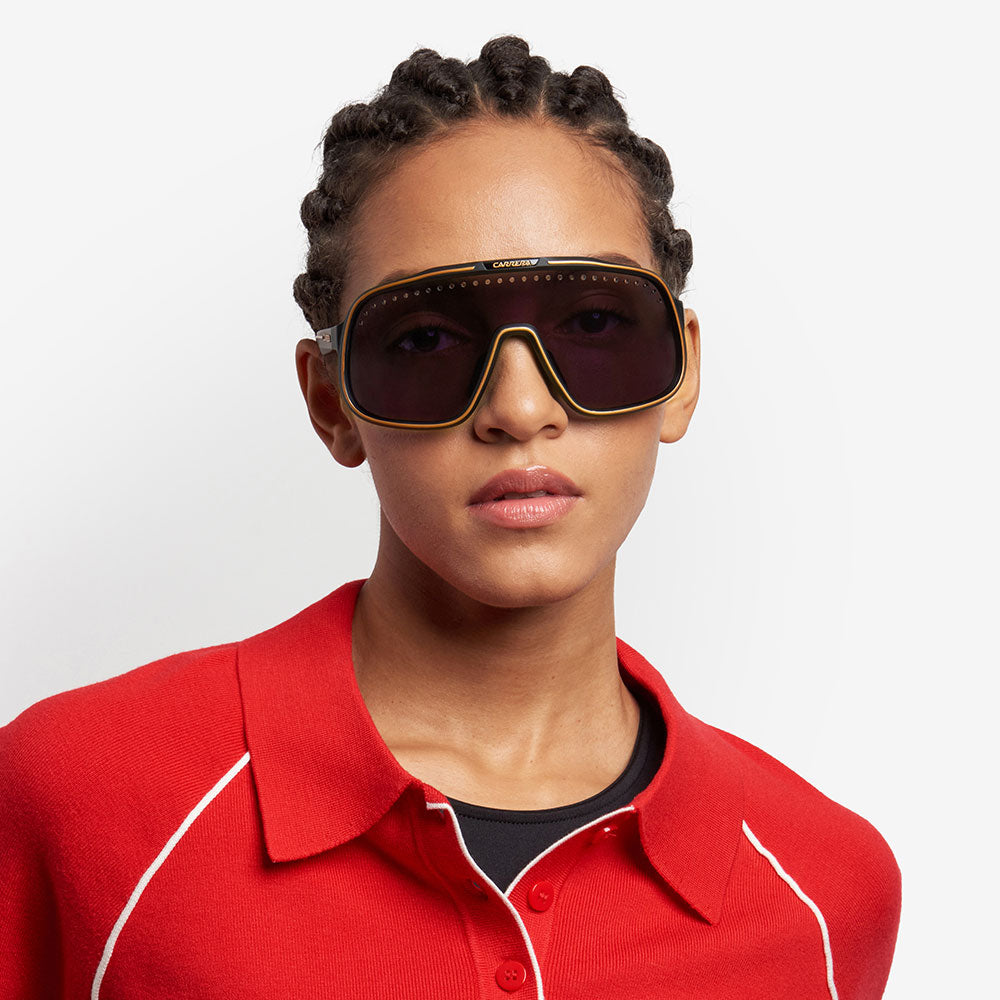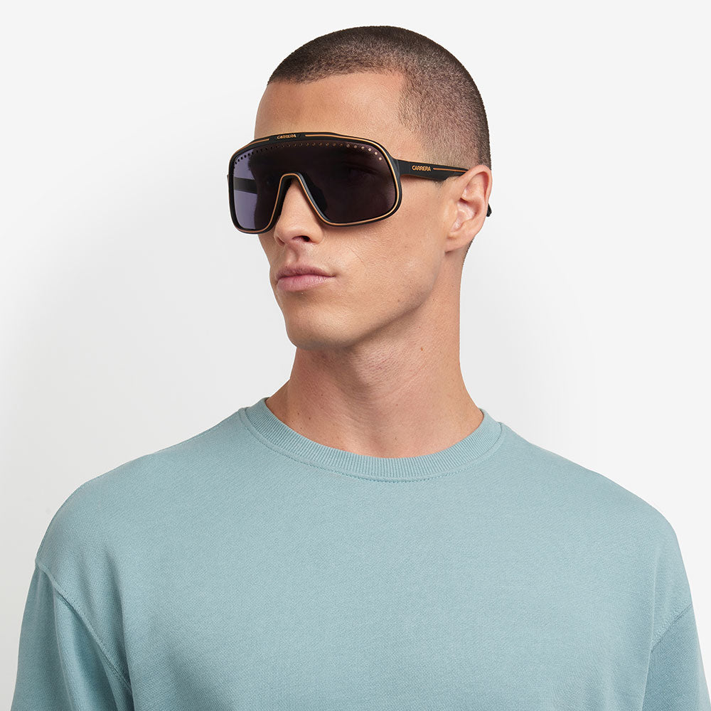 Inspired by sport and designed to be worn everywhere, these sunglasses express the bold style of Carrera. The shield front is decisive and on-trend as it wraps around to the sides, complete with perforations for added ventilation. The lens even comes in mirrored or high-contrast options. Impeccable with sporty outfits and unforgettable as part of street-style ensembles, these sunglasses are designed to be worn with ease, even under a helmet. The front is compatible with prescription clip-in lenses which can be purchased separately.