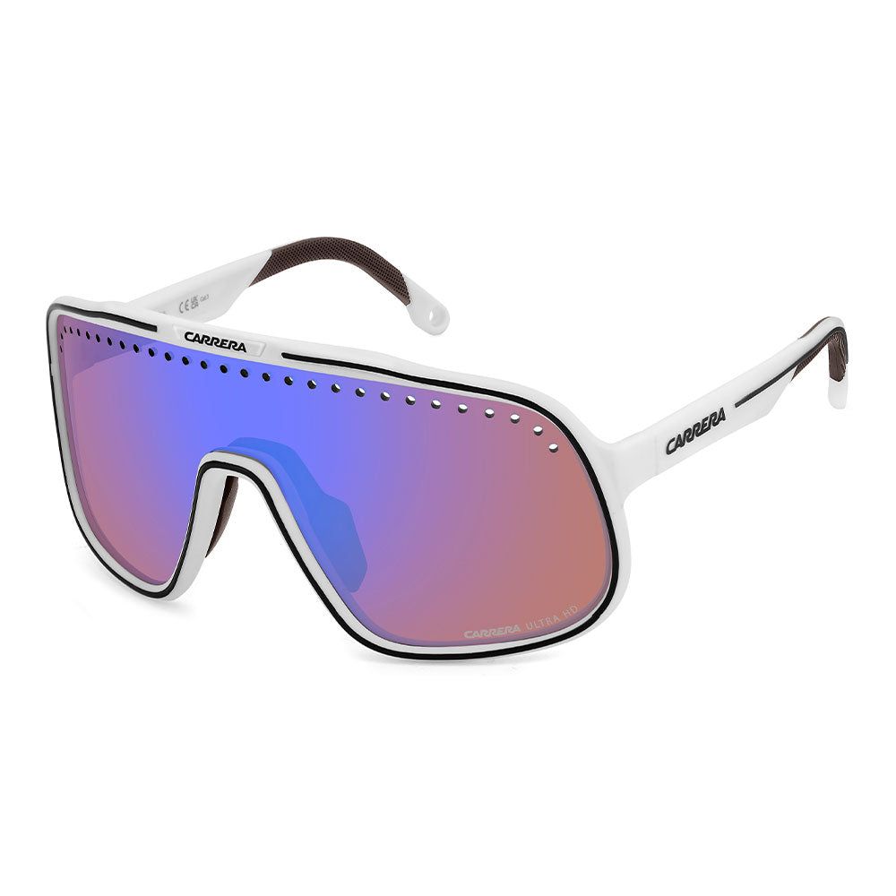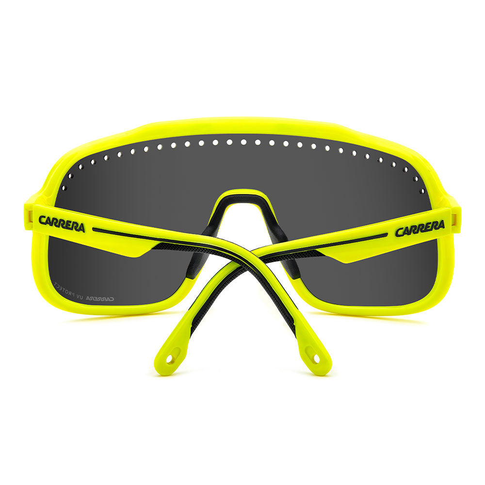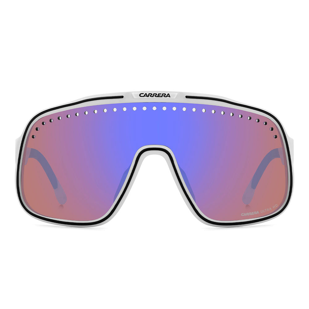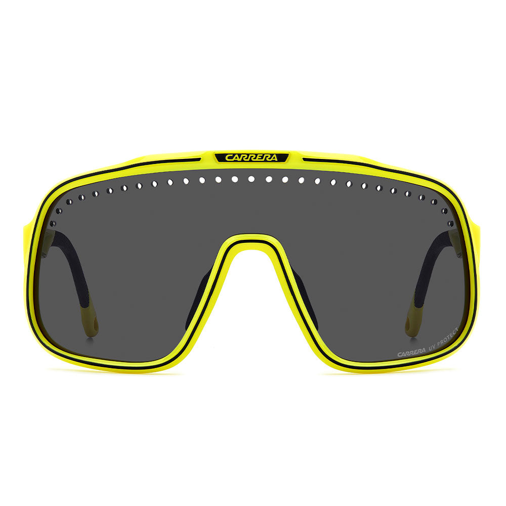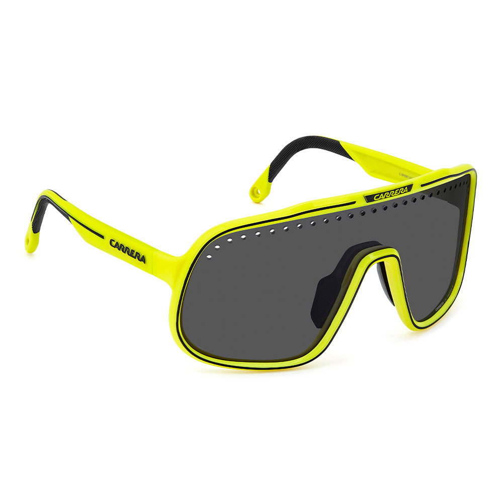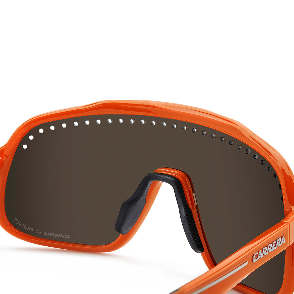 Inspired by sport and designed to be worn everywhere, these sunglasses express the bold style of Carrera. The shield front is decisive and on-trend as it wraps around to the sides, complete with perforations for added ventilation. The lens even comes in mirrored or high-contrast options. Impeccable with sporty outfits and unforgettable as part of street-style ensembles, these sunglasses are designed to be worn with ease, even under a helmet. The front is compatible with prescription clip-in lenses which can be purchased separately.