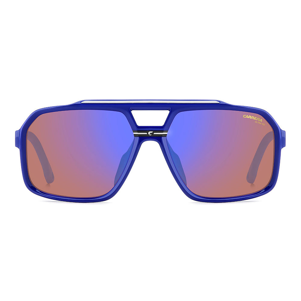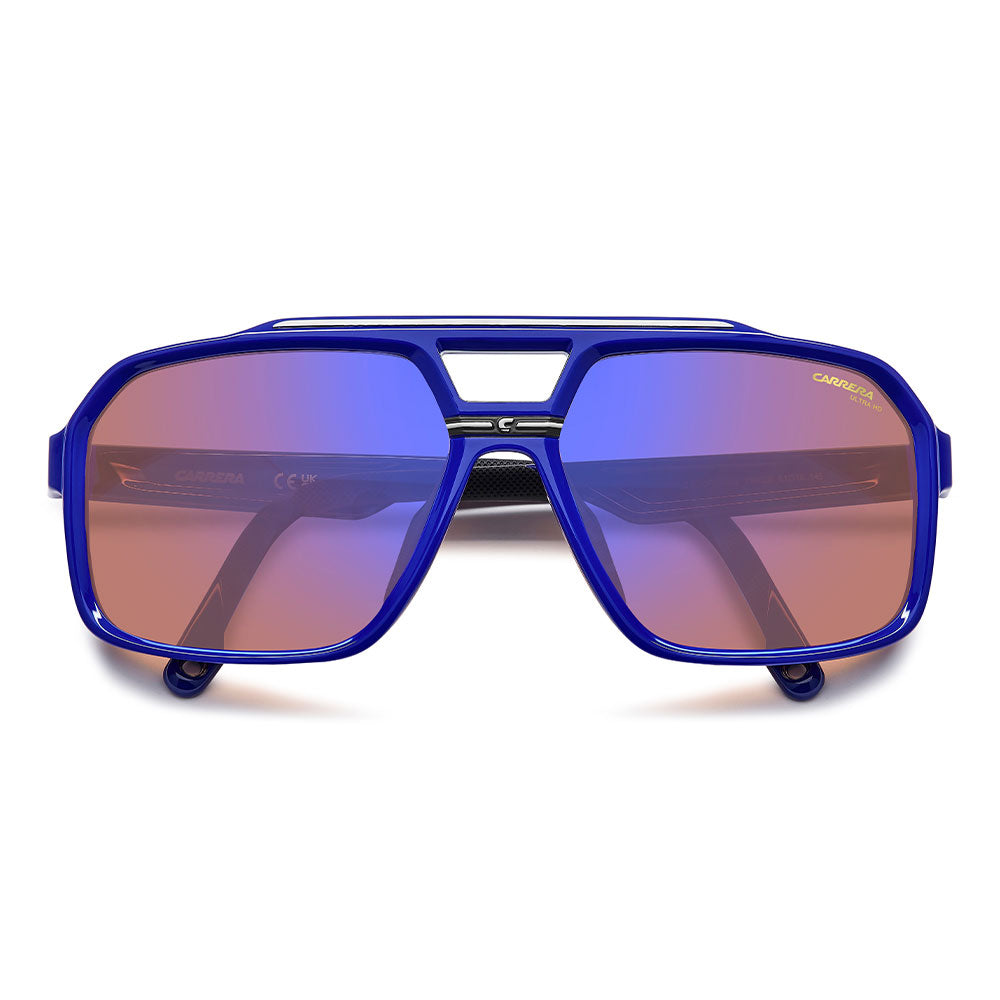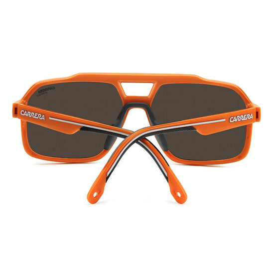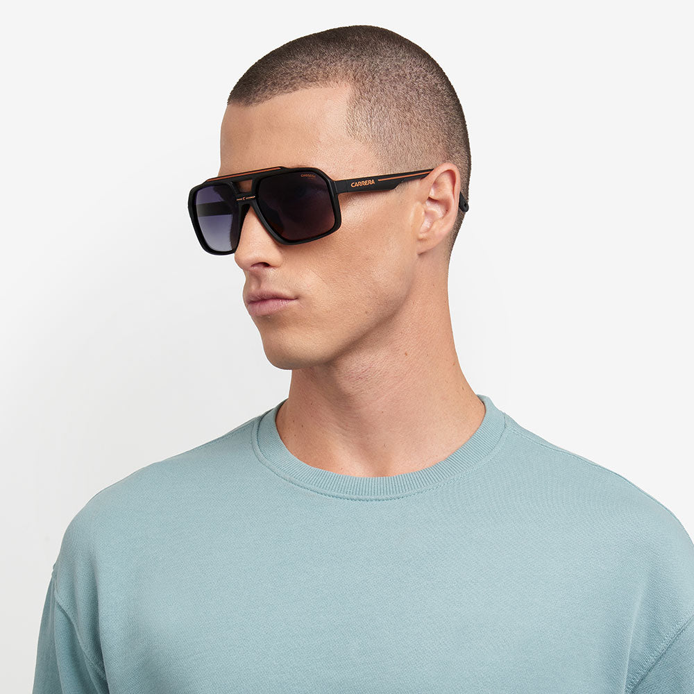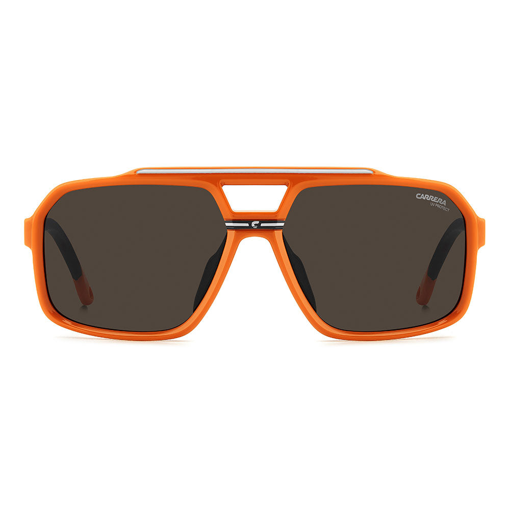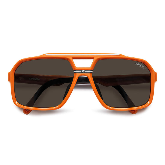 Recognizable aesthetics and sporty attitude define these Carrera sunglasses. Their double-bridge navigator front is a signature design, here in a more full-coverage version. They’re embellished by a horizontal Carrera flag, and come in neutral hues or sporty tones, and in mirrored, high-contrast or polarized lens versions. Whether under a helmet or not, they're made to be flaunted with confidence.
