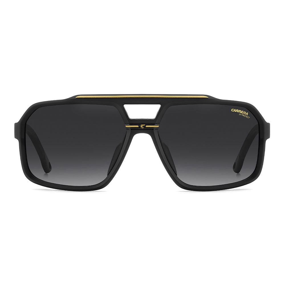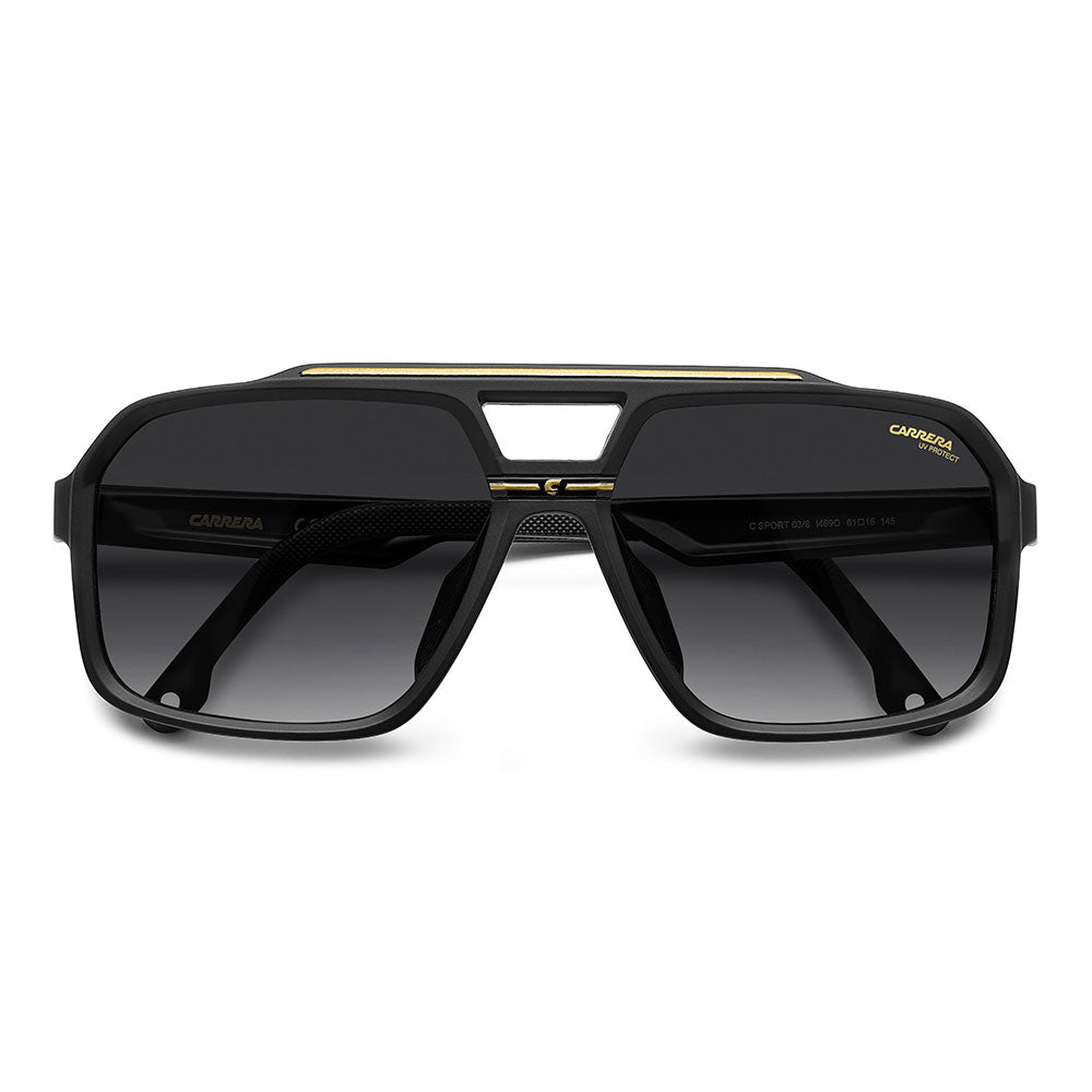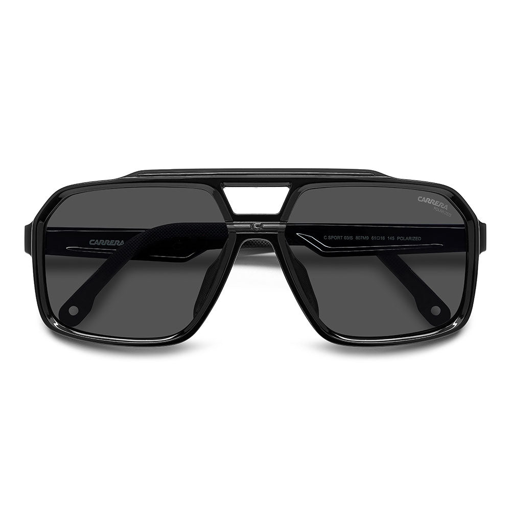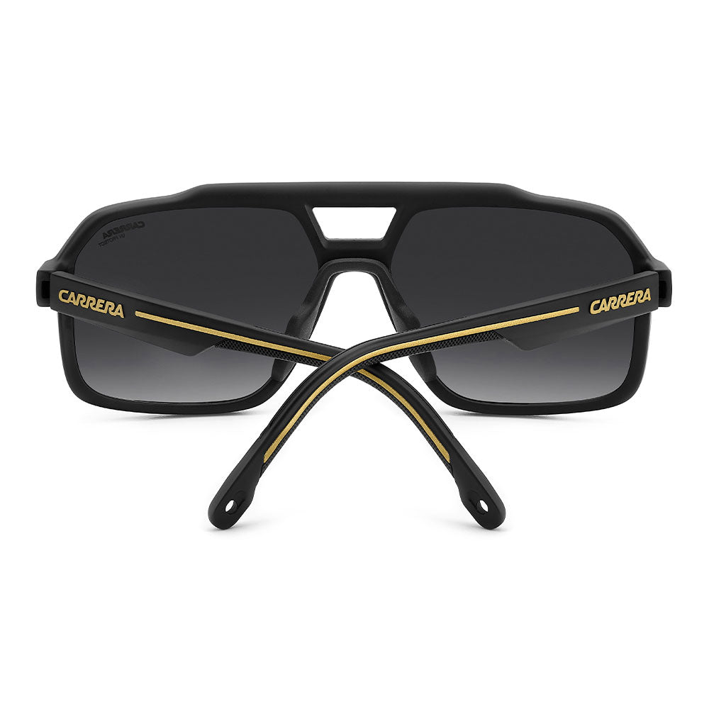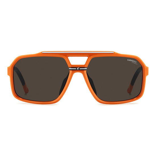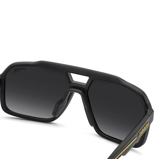 Recognizable aesthetics and sporty attitude define these Carrera sunglasses. Their double-bridge navigator front is a signature design, here in a more full-coverage version. They’re embellished by a horizontal Carrera flag, and come in neutral hues or sporty tones, and in mirrored, high-contrast or polarized lens versions. Whether under a helmet or not, they're made to be flaunted with confidence.