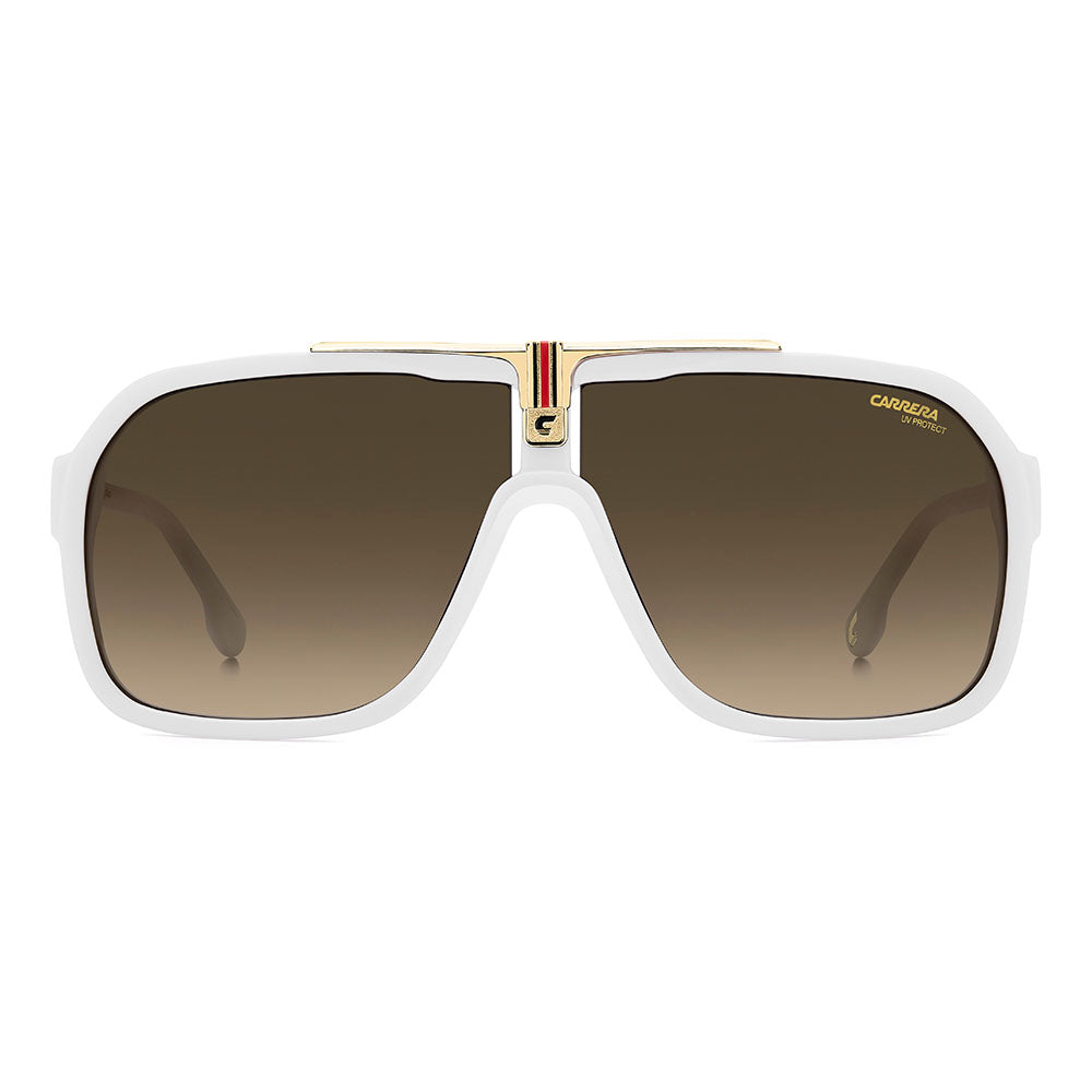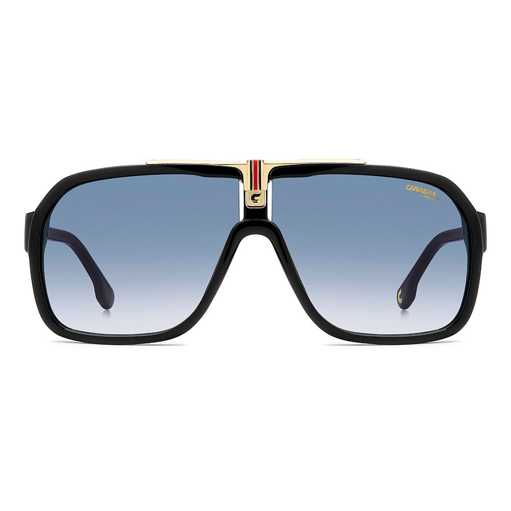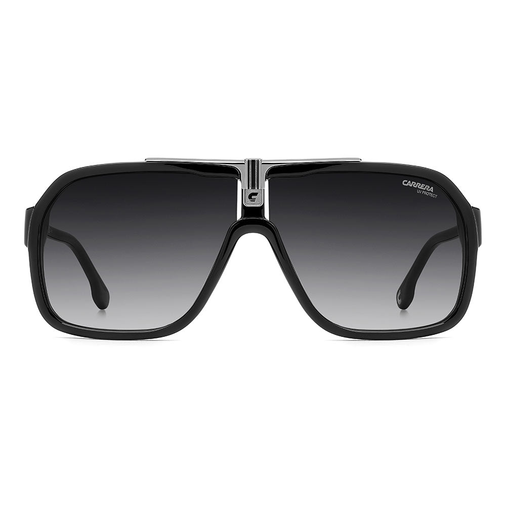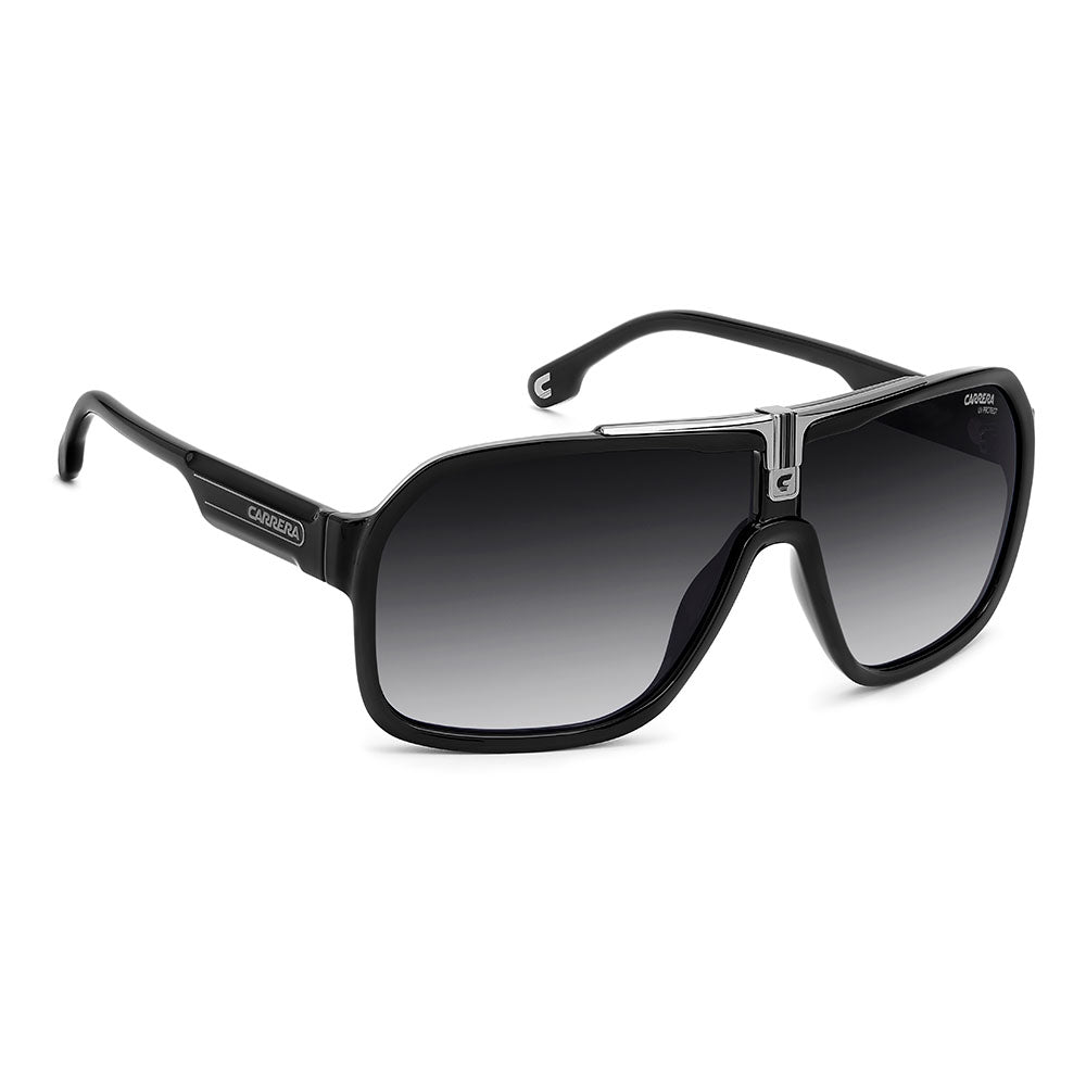 An iconic style adapted to suit today's dynamic lifestyles--these men's sunglasses boast large, rectangular pilot frames, topped with a flat brow bar for a contemporary look. Sculpted from injection-molded polyamide, they feature sleek metal temples detailed with Carrera's trademark Flag motif. Available in a range of colorways inspired by Carrera's legendary heritage.