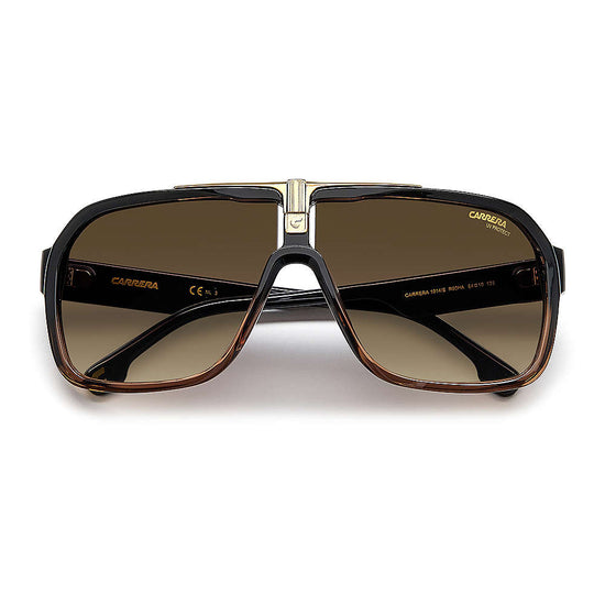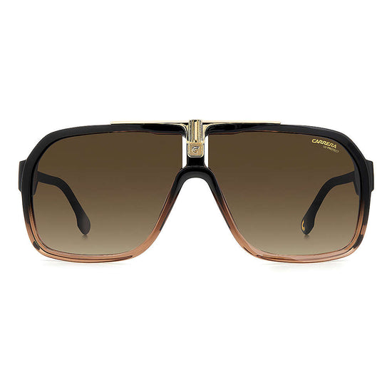An iconic style adapted to suit today's dynamic lifestyles--these men's sunglasses boast large, rectangular pilot frames, topped with a flat brow bar for a contemporary look. Sculpted from injection-molded polyamide, they feature sleek metal temples detailed with Carrera's trademark Flag motif. Available in a range of colorways inspired by Carrera's legendary heritage.