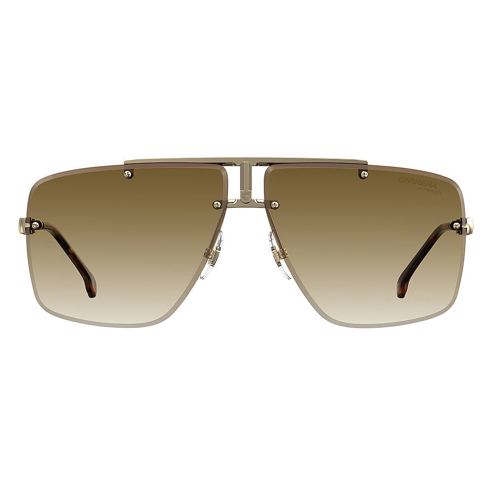 A unique combination of exceptional craft, everyday wearability and serious character, Carrera's latest eyewear collection sees the label's C-logo return to the spotlight. Take these striking rimless sunglasses, for example. Crafted from gold-tone metal, they're detailed with a refreshed version of the brand's trademark: the distinct 'C' proudly positioned center and front. Carrera's logo lettering along the arms, a set of logo-etched gradient lenses and curved acetate end tips complete this streamlined yet statement-making choice.
