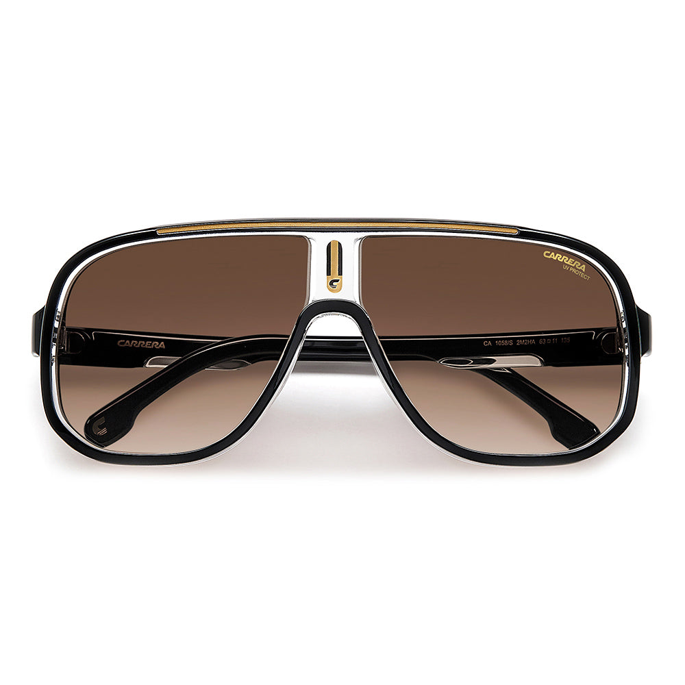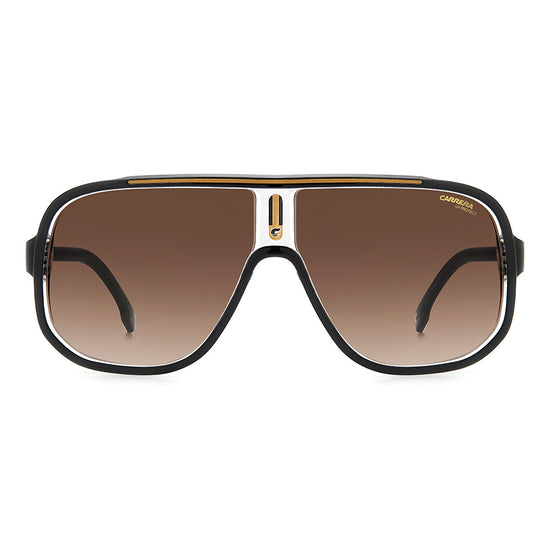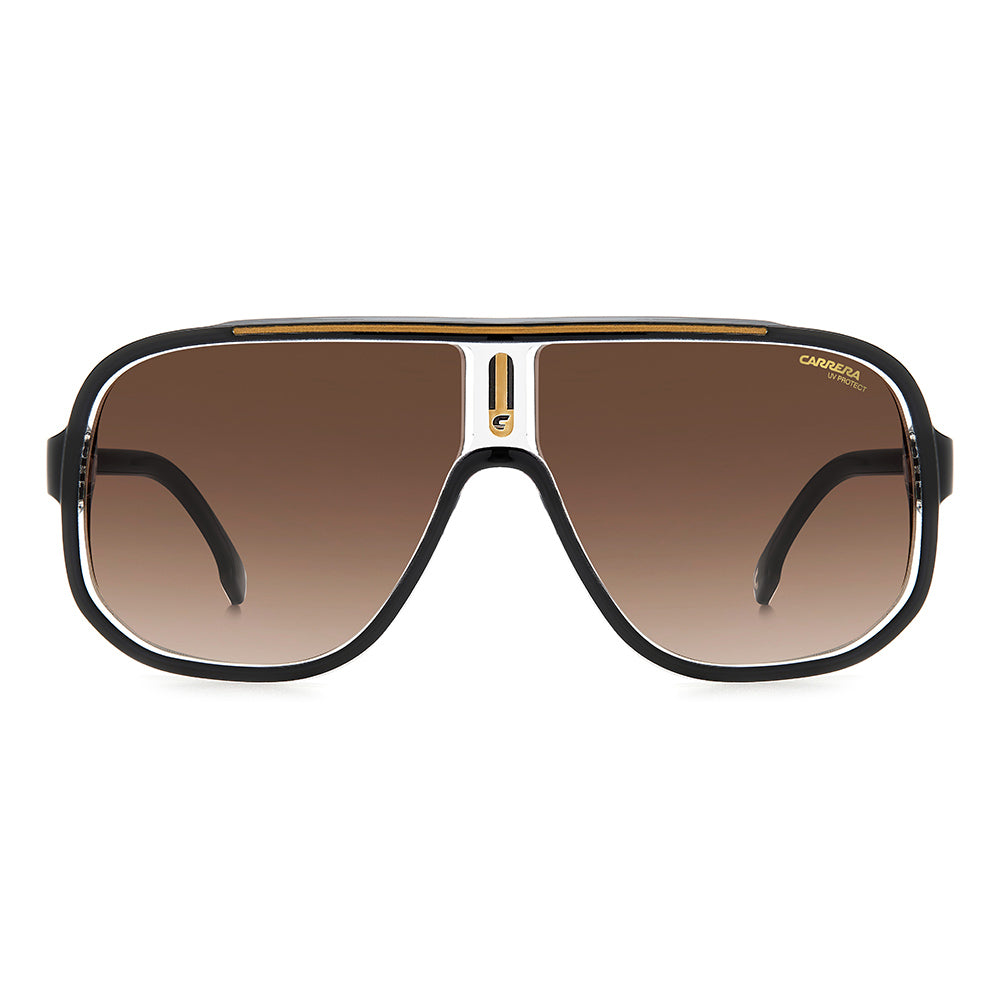 These men's sunglasses give off strong retro vibes due to the navigator frame, so prevalent in Carrera's history. Made of injection-moulded polyamide, they come in neutral shades with contrasting color combinations, the most significant of which is the brand's trademark flag along the temples. The full-coverage frames come with gradient or solid tint lenses (including one polarized option), rendered unforgettable thanks to the Carrera "C" insert.
